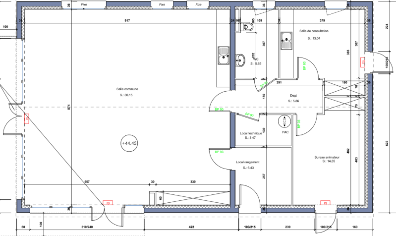 Structure qui fait le lien entre les 30 maisons du site, c’est une salle commune avec un bureau pour l’animateur et une salle de consultation médicale pouvant apporter différents services à la carte (dont le médecin en télécommunication et des services pour du personnel local par exemple).